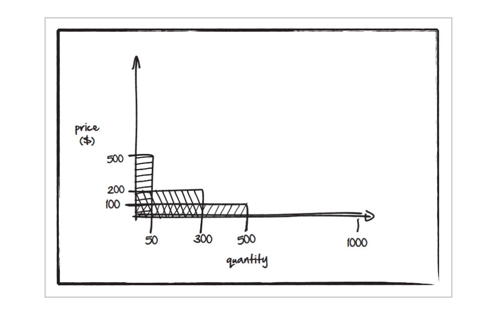 At $0 Price - An invisible, infinitely thin line. This line has 1000 users x $0/user = $0 in profit (area = 0).